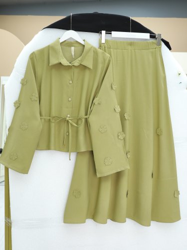 Kolları Ve Eteği Çiçekli Beli Bağcıklı Gömlek Etek İkili Modal Takım Yağ Yeşili