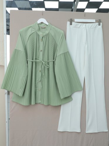 Gold Düğmeli Önü Ve Kolları Pliseli Bağcıklı Gömlek AYeşil