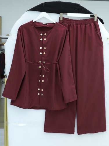 Çift Çıtçıt Detaylı Yuvarlak Yaka Bol Paça Pantolonlu Modal Takım Bordo