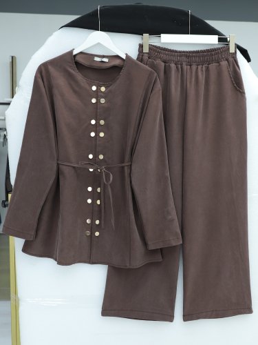 Çift Çıtçıt Detaylı Yuvarlak Yaka Bol Paça Pantolonlu Modal Takım Kahve