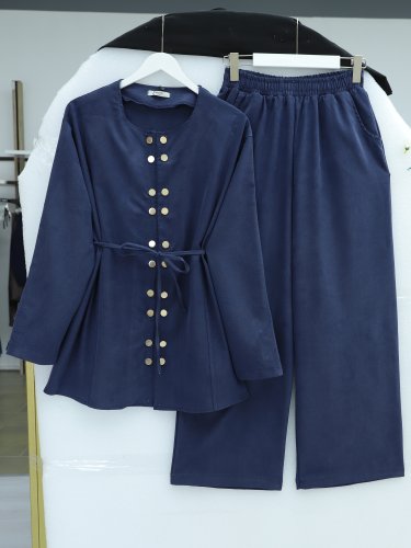 Çift Çıtçıt Detaylı Yuvarlak Yaka Bol Paça Pantolonlu Modal Takım Laci