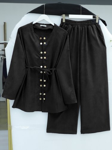 Çift Çıtçıt Detaylı Yuvarlak Yaka Bol Paça Pantolonlu Modal Takım Siyah
